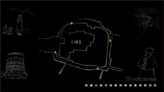3)重大節日模式下所有照明燈具全開,重要節點投影經文開啟,使大昭寺成為一個巨大的轉經筒與朝拜的人一起緩緩轉動。