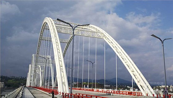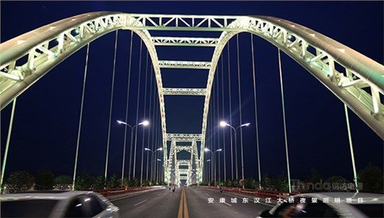 安康市城東漢江大橋軸線呈南北走向,大橋為剛梁柔拱的七孔系桿拱橋,中間五孔設置拱肋。整體簡潔、大方、現代、美觀,橋梁主體為乳白色,橋墩及梁腹顏色為亞灰色,大橋全長1907.21m,其中主橋長810.0m,南北引橋共長1097.21米,橋軸線與漢江基本正交,與江南巴山東路設分離式立交,與江北G316設環形平交(遠期成菱形立交),本項目為獨立特大橋工程。