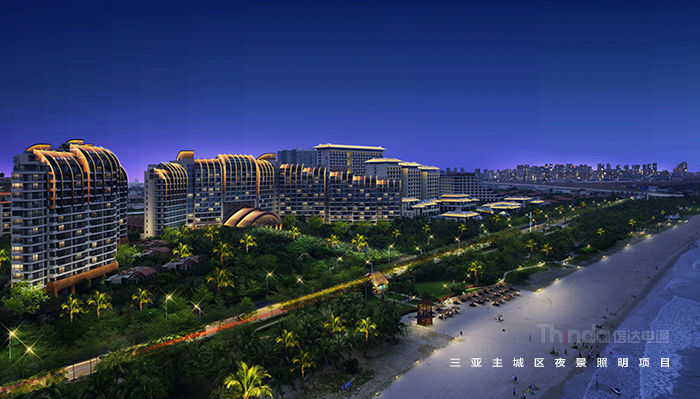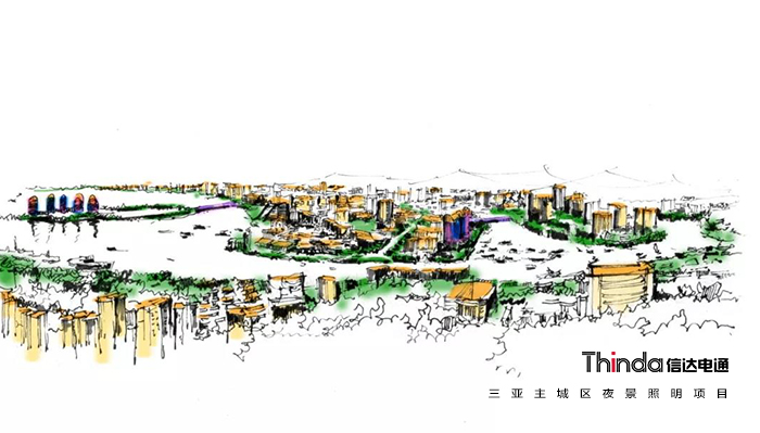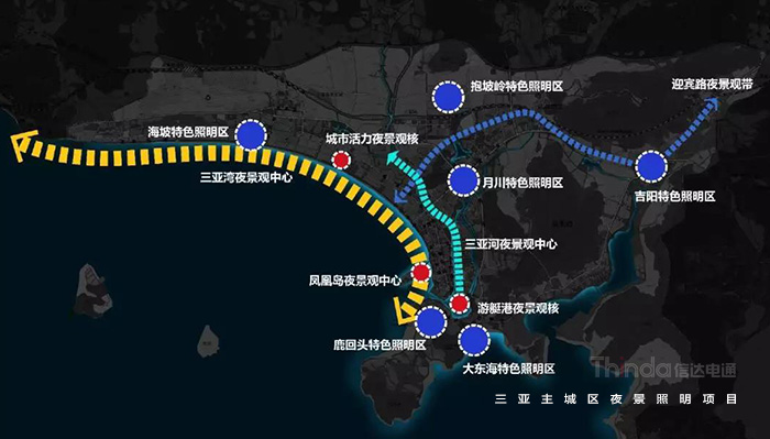 三亞的夜景燈光要體現熱帶海濱旅游度假村的城市特色,著力打造“金色屋頂”,以亮度適中的黃白暖色調體現安靜柔和的效果,展現“國際、熱帶、濱海、旅游”核心氣質。信達電通的設計范圍包括“一灣”—三亞灣夜景觀帶,“兩帶”—三亞河夜景觀帶、迎賓路夜景觀帶,“三心”—城市活力中心、鳳凰島、游艇港,“六區”—海坡特色照明區、鹿回頭特色照明區、抱坡嶺特色照明區、月川特色照明區、大東海特色照明區、吉陽特色照明區。