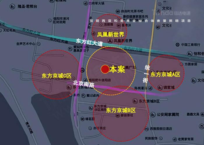 西亞和美商業(yè)廣場地處于河南省信陽市,位于東方紅大道、南臨北京南路、東臨統(tǒng)一街,周邊有鳳凰新世界、東方京城、軸線之廊,位置優(yōu)越,交通便利。這里信陽人民平時生活娛樂與購物餐飲的地方,也是IGA中國區(qū)優(yōu)秀零售商。目前商業(yè)廣場夜景照明已經(jīng)跟不上整體的商業(yè)需求,急需進(jìn)行照明設(shè)計施工改造升級,為此信陽西亞和美業(yè)主聯(lián)系到信達(dá)電通,雙方根據(jù)本案開展照明設(shè)計施工合作。